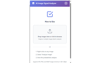 이 확장 프로그램은 AI 확률 점수가 포함된 포괄적인 분석 보고서를 제공하여 사용자가 이미지를 AI 가능성, 불확실 또는 실제 가능성으로 분류하는 데 도움을 줍니다. 다양한 이미지 형식을 지원하며 우클릭 분석 및 로컬 이미지 업로드를 위한 사용자 친화적인 인터페이스를 제공합니다. 모든 분석은 데이터 추적 없이 브라우저 내에서 로컬로 발생하므로 개인 정보 보호가 우선시됩니다. 전반적으로 AI 이미지 신호 분석기는 시각적 콘텐츠의 진위에 대해 걱정하는 모든 사람에게 필수적인 도구입니다.